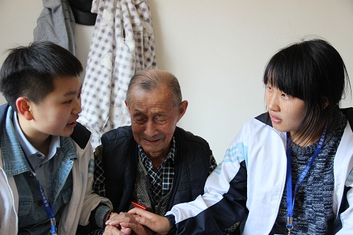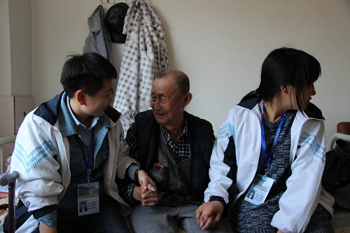 给同学们留下最深刻印象的是一位九十九岁高龄的老爷爷,将近期颐之年依然精神矍铄,他手里一直拿着一张上次同学们来探望时和他拍的合照,独自坐在阳光下,像欣赏一个宝贝一样看个不停,安详又平和,这一幕也让同学们深受感动,不禁想起了自己的爷爷奶奶。