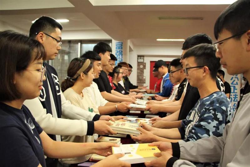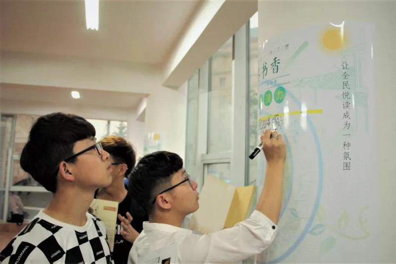 活动开始,书桌上摆放了大大小小颜色各异的书,或关于心理、或关于哲学又或者是言情题材的书籍。16届团委副书记付恒利,16届极光青年志愿者协会会长闫成龙和16届少民女生部部长李胜男更是用心的在书里写上寄语赠与他人,这一本本书籍的接力也象征着文化在不断的传承。随后,部长们在海报上写下自己的读书体会。