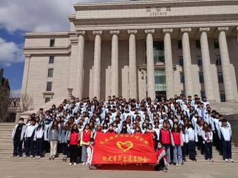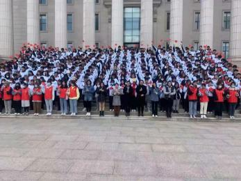 午间,志愿者在老师的安排下,列队图书馆前,手拿小红旗随风起舞,激昂的诵读: