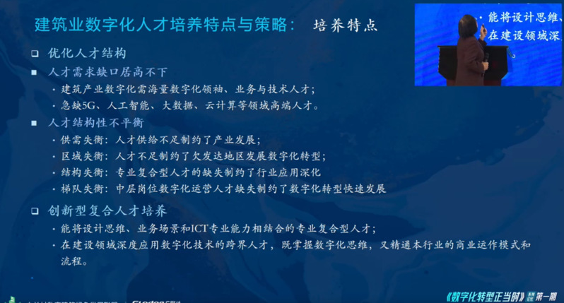 随后由来自清华大学土木工程系教授张建平、广联达数字高校事业部专家王全杰分别进行了以《建筑产业数字化发展人才培养策略与方案》、《建筑行业人才链建设》为主题的演讲。张教授对智能建造专业的战略发展背景和未来展望做了讲解,其中包括新理论新技术,战略意义不仅掌握海量数据,更在于对数据进行专业化处理,提高数据“加工能力”,实现数据的“增值”,成为“信息资产”。智能建造是面向工程产品全生命期,深度融合新一代信息技术和人工智能技术的建造技术,关键技术与BIM、云计算、物联网、区块链等新一代信息技术和人工智能技术的深度融合。她详细讲解了“四位一体”数字化人才培养体系,建议院校教育和社会培训相融合,对院校的培养方案设立思路给予建议,携手企业共同谋求新驱动、新引领、新策略、新突破、新发展。广联达数字高校事业部专家王全杰从产教融合的角度,对建筑行业人才供应链提出他的构想。对于目前的新毕业的员工,提出新颖的培养计划,展示了培训方案。