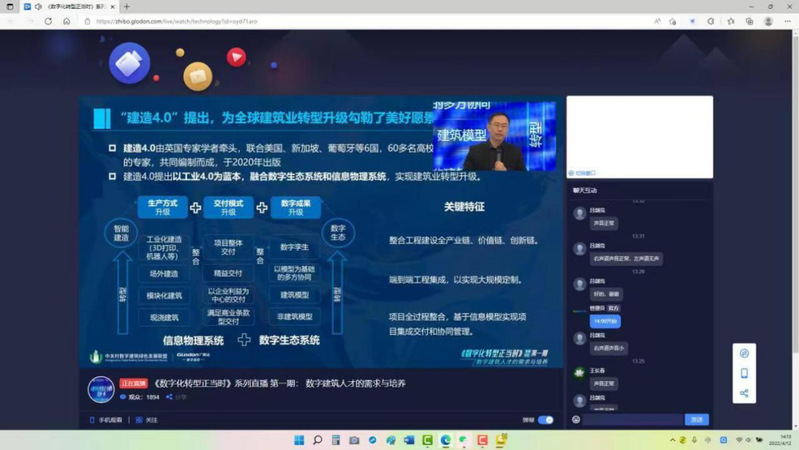 2022年4月12日公司组织教师在线观看《数字化转型正当时》系列直播论坛第一期——数字建筑人才的需求与培养。该论坛由中关村数字建筑绿色发展联盟联合广联达数字高校事业部特邀业内知名高校专家、企业家共同探讨产业转型升级背景下数字建筑人才的需求与培养,本次论坛受到了全国建筑类高校和行业企事业单位广泛关注,当天线上观看人数4140人次,是一次有价值、有深度、可落地的思想碰撞,也是引导建筑类背景高校协同助力建筑产业数字化转型升级的风向标。