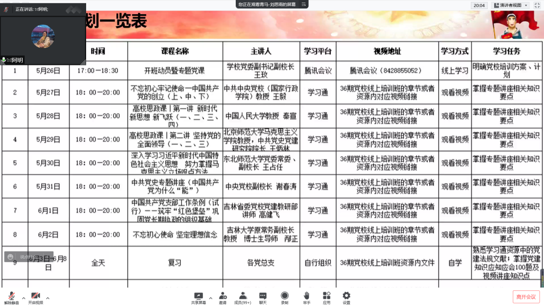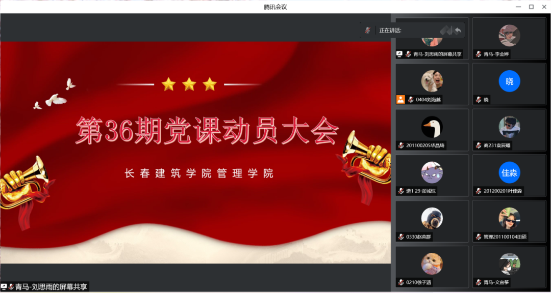 会议开始,由刘悦明老师宣读了党课的基本情况和一些相关要求,主要内容为--党课的重要性。党课是深入学习和理解党的章程、路线的重要途径,党课对于党员的培养和教育是非常重要的。此次党课主要采取线上自学的方式,学员签到后进入相应的视频链接开始听课。学员们要按时签到,一定要认真听讲,在课上也要做好笔记。党课培训之后会采取“线上”考试的方式检验党课培训的结果是否合格。会议最后,刘悦明老师再一次强调了学习党课对于认识和了解中国共产党发展历程的重要性,希望同学们可以珍惜好这次党课培训的机会,端正自己的学习态度,永不懈怠地推进实践,做到自律、自觉、认真地学习党课知识。