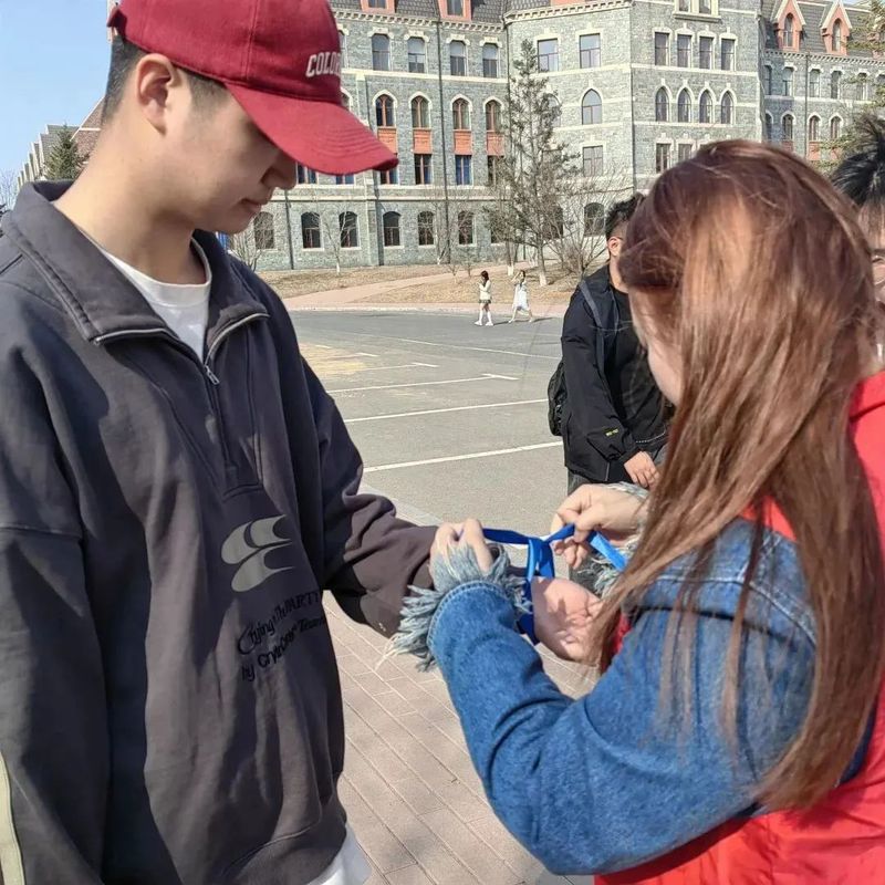 活动当天,这22名参与活动的志愿者还按照事先分组,在市区轻轨车站、公司及周边,手持蓝丝带及“我接纳”“我理解”等孤独症日倡导语,与路人合影,并为其系上蓝丝带,传递爱心,践行“爱让春城飘蓝”活动主题。