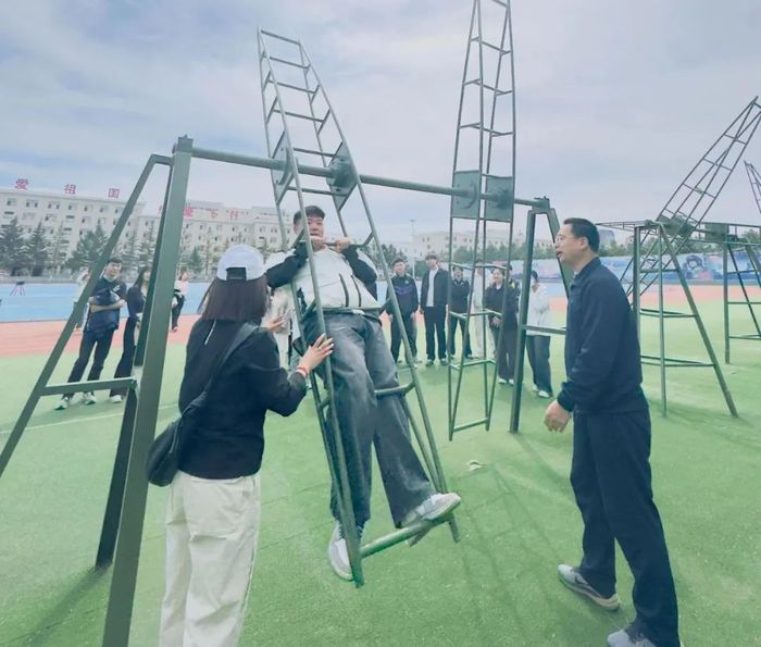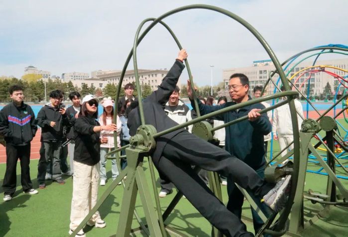 走进军体心理综合训练场,张晓芝老师特邀空军航空大学军教系李主任为同学们演示指导固体、旋体、信任背摔等多种飞行运动设备器材。张晓芝老师表示,同学们的心理韧性与身体素质同等重要,这些设备不仅考验生理极限,更锤炼临危不乱的心理素质。在场同学们还亲身体验模拟项目,在虚实交织的极端环境中直面挑战。