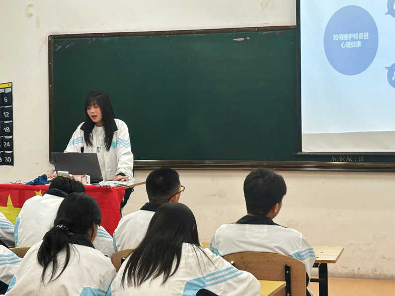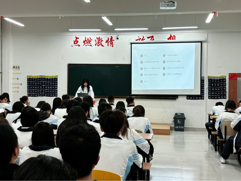 班会现场,气氛热烈而温馨。心理新泉协会成员站在讲台上,借助精心制作的PPT,为大家讲解心理健康知识.